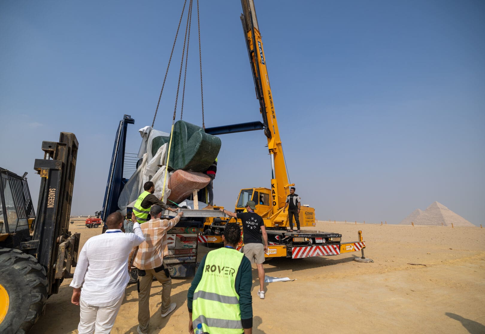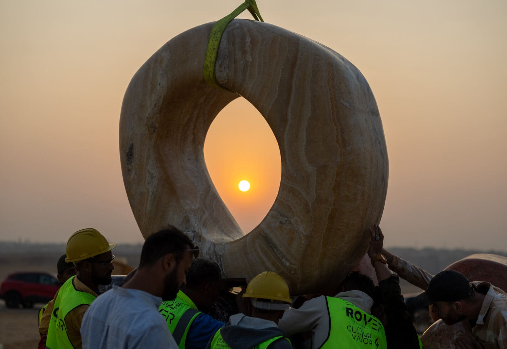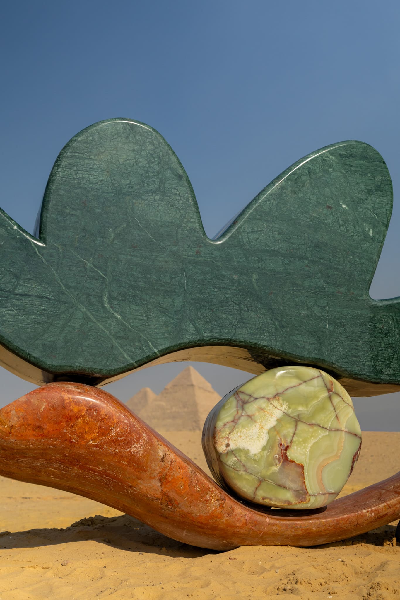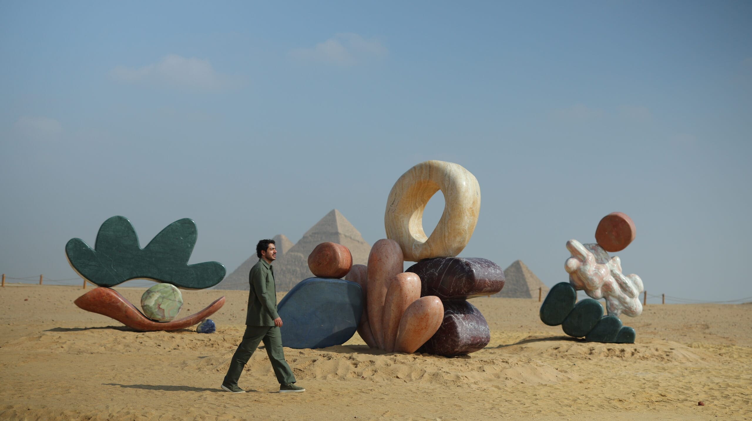 The work comprises three monumental formations crafted from marble, onyx, travertine, and quartzite. From a distance, the sculptures appear as a single, unified presence aligned with the pyramids. Up close, they unfold into an immersive landscape of organic shapes and intuitive forms. Each element reflects Proba’s distinctive visual language, rooted in nature, emotion, and vibrant expression.